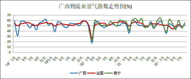 广西物流与采购联合会发布的2022年8月份广西物流业景气指数(LPI)为51.5%,与上月相比上升2.5个百分点。