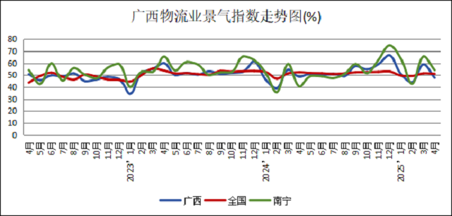 广西物流与采购联合会发布的2025年4月份广西物流业景气指数(LPI)为47.8%,较上月下降11.2个百分点。