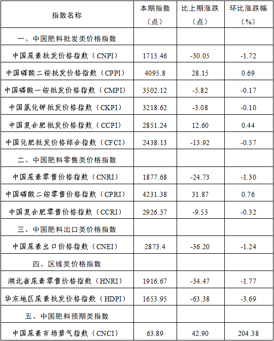 10月13日中国尿素批发价格指数(CNPI)为1713.46点,环比下跌30.05点,跌幅为1.72%;同比下跌380.36点,跌幅为18.17%;比基期下跌75.22点,跌幅为4.21%。