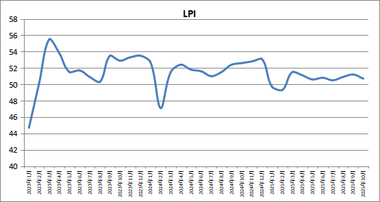 中国物流与采购联合会发布的2025年10月份中国物流业景气指数为50.7%,环比回落0.5个百分点。在前期需求充分释放基础上,10月份物流业景气指数有所回落,但仍保持扩张态势,其中业务总量指数、新订单指数、资金周转率指数、物流服务价格指数、固定资产投资完成额指数、从业人员指数和业务活动预期指数处在景气区间。