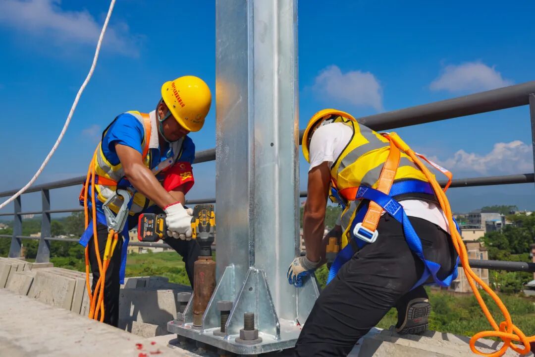 本次组立的支柱高9米、重约1吨。施工过程中,项目建设团队采用自主研发的高铁锂电精密拧紧系统、腕臂偏移测量仪等智能建设工机具,同时探索使用信息化施工生产管理平台,通过建立物资管理和预配中心,实现物资设备管理和生产调配的集约化、工厂化、信息化,顺利完成接触网第一杆支柱组立。