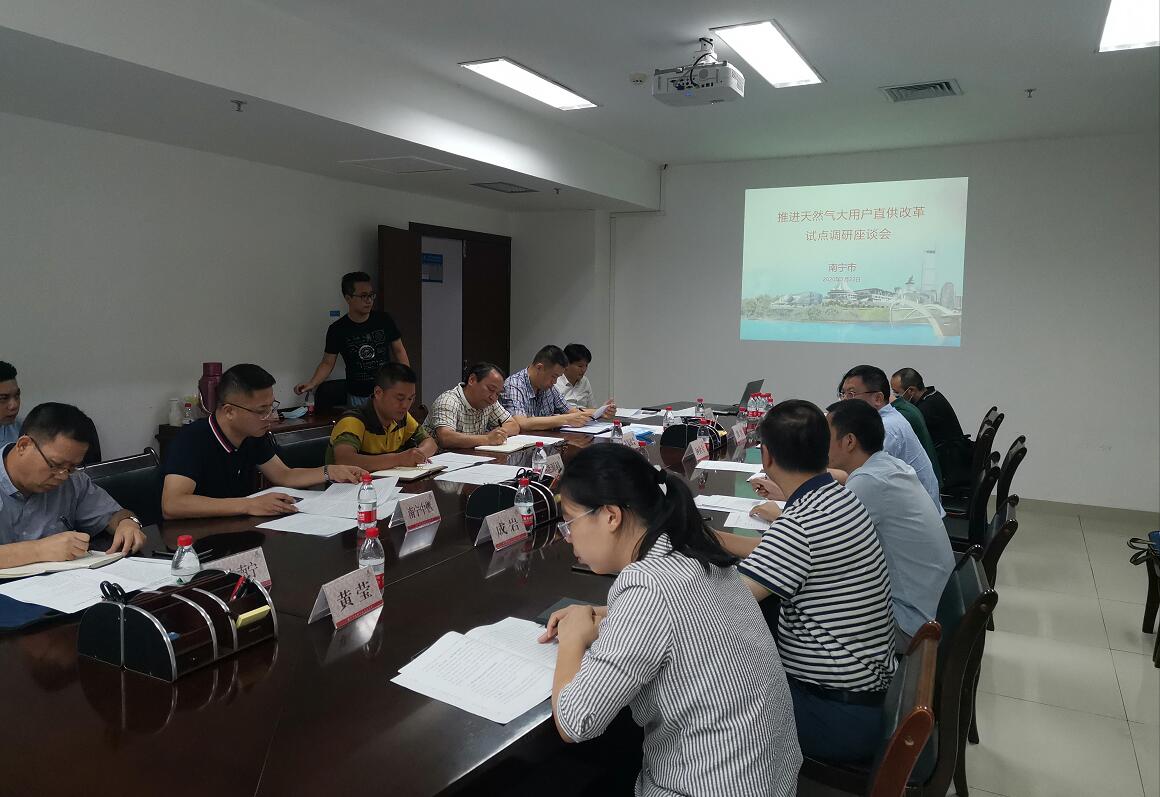 为贯彻落实党中央、国务院关于深化石油天然气体制改革的决策部署和《广西壮族自治区人民政府办公厅关于印发广西天然气管网运营机制改革实施方案的通知》(桂政办发〔2020〕39号)要求,推进我区天然气大用户直供改革试点工作。7月22日,自治区发展改革委组织调研组赴南宁市调研,并召开座谈会。南宁市发展改革委就南宁市供用气情况作了汇报,并对直供改革试点工作发表了意见和建议。