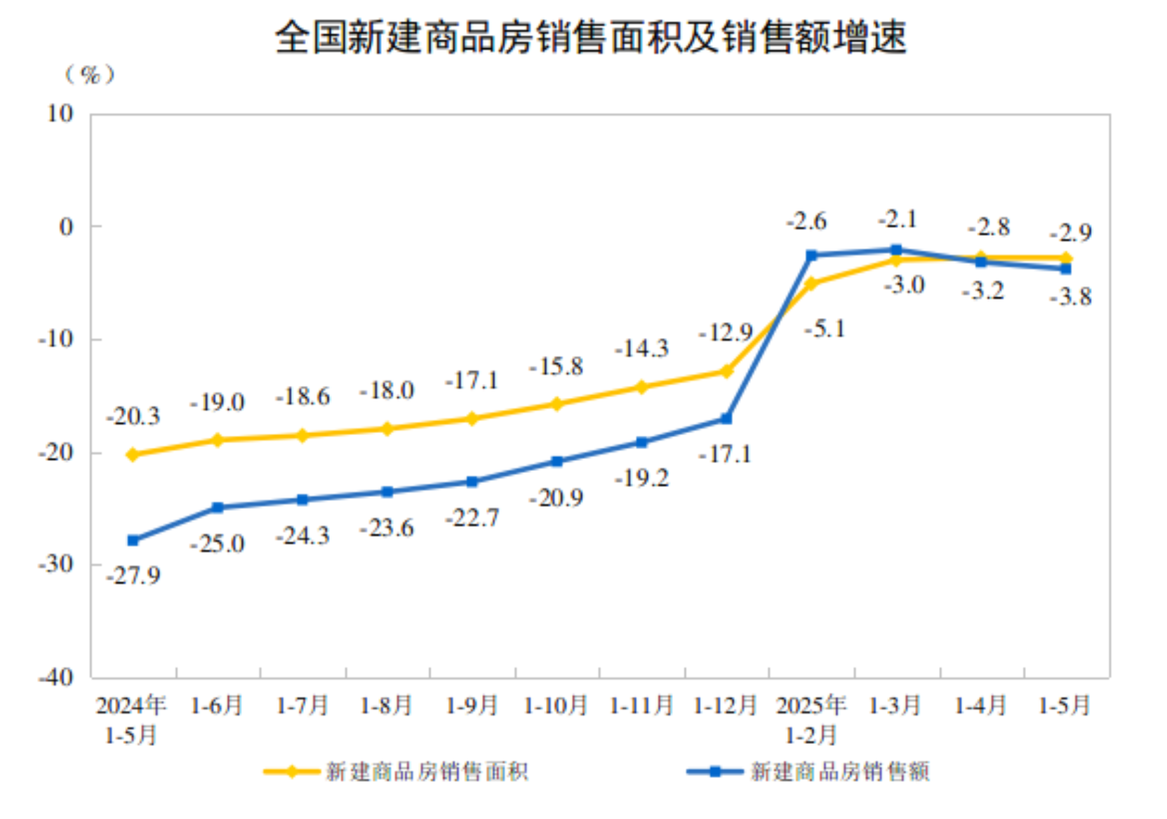 1—5月份,新建商品房销售面积35315万平方米,同比下降2.9%;其中住宅销售面积下降2.6%。新建商品房销售额34091亿元,下降3.8%;其中住宅销售额下降2.8%。