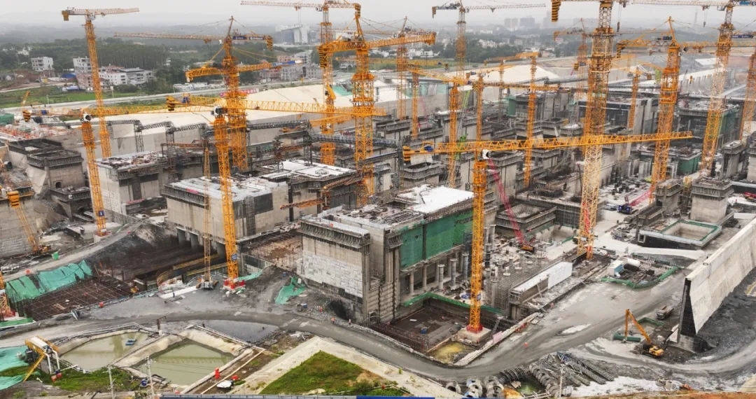 企石枢纽上下闸首结构复杂,多台套设备在狭窄空间同时立体交叉施工作业,混凝土浇筑面临施工难度大、温控难等问题。平陆运河建设管理团队采用BIM技术,提前模拟模板设计,确保结构精度;创新采用智能布料系统与温控设备,解决大体积混凝土骨料分离等困难;施行贯穿大体积混凝土从生产、运输、入仓、浇筑、内部控温等全周期管理的温控手段,确保混凝土在抵达仓面时满足温度要求;同时,在浇筑过程中,冷却机组昼夜工作,预埋于混凝土内的冷却水管通过智能温控系统实现水温、流量、流向的精准调控,确保混凝土浇筑质量。