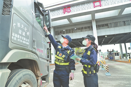 广西龙邦出入境边防检查站移民管理警察检查通关货车。 蒙正欢/摄