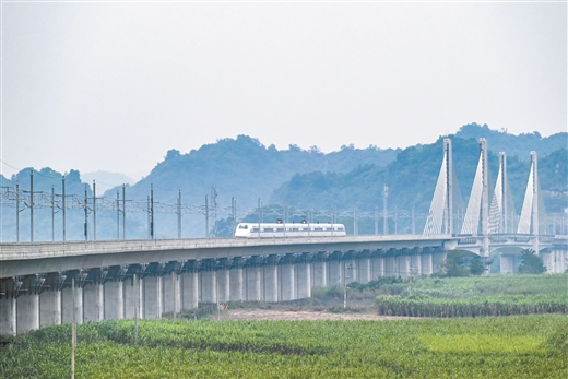 南凭高铁崇左至凭祥段首发列车通过崇左上金左江双线特大桥。陈泉任/摄