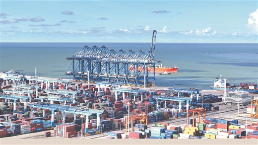 北部湾畔,碧波万顷。在广西钦州港大榄坪南作业区,多艘大型集装箱船停靠,巨型桥吊如钢铁巨人般精准起吊集装箱,一辆辆无人驾驶智能导引运输车往来穿梭。