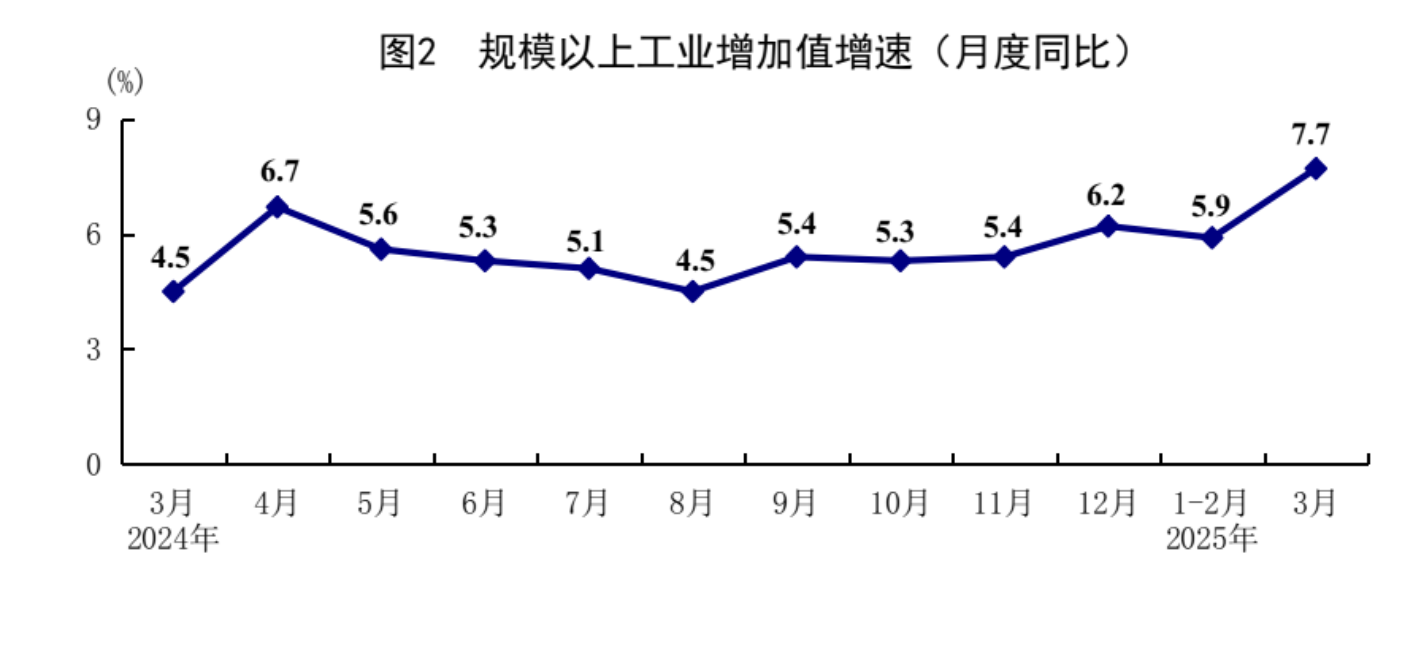一季度,全国规模以上工业增加值同比增长6.5%,比上年全年加快0.7个百分点。分三大门类看,采矿业增加值同比增长6.2%,制造业增长7.1%,电力、热力、燃气及水生产和供应业增长1.9%。装备制造业增加值同比增长10.9%,比上年全年加快3.2个百分点;高技术制造业增加值增长9.7%,加快0.8个百分点。分经济类型看,国有控股企业增加值同比增长4.2%;股份制企业增长7.2%,外商及港澳台投资企业增长4.0%;私营企业增长7.3%。分产品看,新能源汽车、3D打印设备、工业机器人产品产量同比分别增长45.4%、44.9%、26.0%。3月份,规模以上工业增加值同比增长7.7%,比1-2月份加快1.8个百分点;环比增长0.44%。3月份,制造业采购经理指数为50.5%,比上月上升0.3个百分点;企业生产经营活动预期指数为53.8%。1-2月份,全国规模以上工业企业实现利润总额9110亿元,同比下降0.3%,降幅比上年全年收窄3.0个百分点。