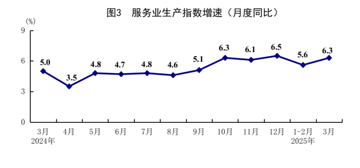 一季度,服务业增加值同比增长5.3%,比上年全年加快0.3个百分点。其中,信息传输、软件和信息技术服务业,租赁和商务服务业,交通运输、仓储和邮政业,批发和零售业,住宿和餐饮业增加值分别增长10.3%、10.2%、7.2%、5.8%、5.1%。3月份,全国服务业生产指数同比增长6.3%,比1-2月份加快0.7个百分点。其中,信息传输、软件和信息技术服务业,租赁和商务服务业,批发和零售业,住宿和餐饮业生产指数分别增长9.9%、9.3%、7.7%、6.0%。1-2月份,规模以上服务业企业营业收入同比增长8.2%,比上年全年加快1.0个百分点。3月份,服务业商务活动指数为50.3%,比上月上升0.3个百分点;服务业业务活动预期指数为57.5%,上升0.6个百分点。其中,水上运输、航空运输、邮政、电信广播电视及卫星传输服务、货币金融服务等行业商务活动指数位于55.0%以上较高景气区间。