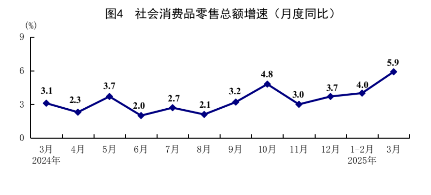 一季度,社会消费品零售总额124671亿元,同比增长4.6%,比上年全年加快1.1个百分点。按经营单位所在地分,城镇消费品零售额108057亿元,同比增长4.5%;乡村消费品零售额16614亿元,增长4.9%。按消费类型分,商品零售额110644亿元,增长4.6%;餐饮收入14027亿元,增长4.7%。基本生活类和部分升级类商品销售增势较好,限额以上单位粮油食品类、日用品类、体育娱乐用品类商品零售额分别增长12.2%、6.8%、25.4%。消费品以旧换新政策继续显效,限额以上单位通讯器材类、文化办公用品类、家用电器和音像器材类、家具类商品零售额分别增长26.9%、21.7%、19.3%、18.1%。全国网上零售额36242亿元,同比增长7.9%。其中,实物商品网上零售额29948亿元,增长5.7%,占社会消费品零售总额的比重为24.0%。3月份,社会消费品零售总额同比增长5.9%,比1-2月份加快1.9个百分点;环比增长0.58%。一季度,服务零售额同比增长5.0%。