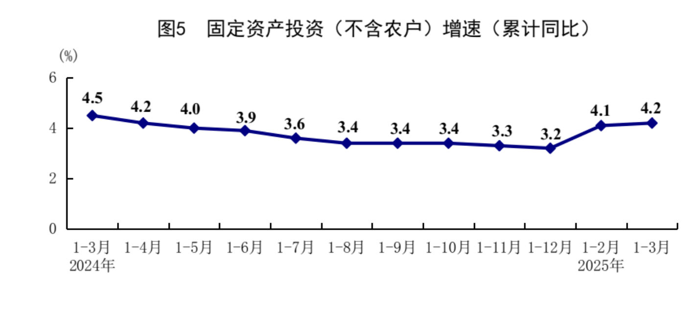 一季度,全国固定资产投资(不含农户)103174亿元,同比增长4.2%,比上年全年加快1.0个百分点;扣除房地产开发投资,全国固定资产投资增长8.3%。分领域看,基础设施投资同比增长5.8%,制造业投资增长9.1%,房地产开发投资下降9.9%。全国新建商品房销售面积21869万平方米,同比下降3.0%,降幅比1-2月份收窄2.1个百分点;新建商品房销售额20798亿元,下降2.1%,降幅收窄0.5个百分点。分产业看,第一产业投资同比增长16.0%,第二产业投资增长11.9%,第三产业投资增长0.1%。民间投资增长0.4%;扣除房地产开发投资,民间投资增长6.0%。高技术产业投资同比增长6.5%,其中信息服务业、航空航天器及设备制造业、计算机及办公设备制造业、专业技术服务业投资分别增长34.4%、30.3%、28.5%、26.1%。3月份,固定资产投资(不含农户)环比增长0.15%。