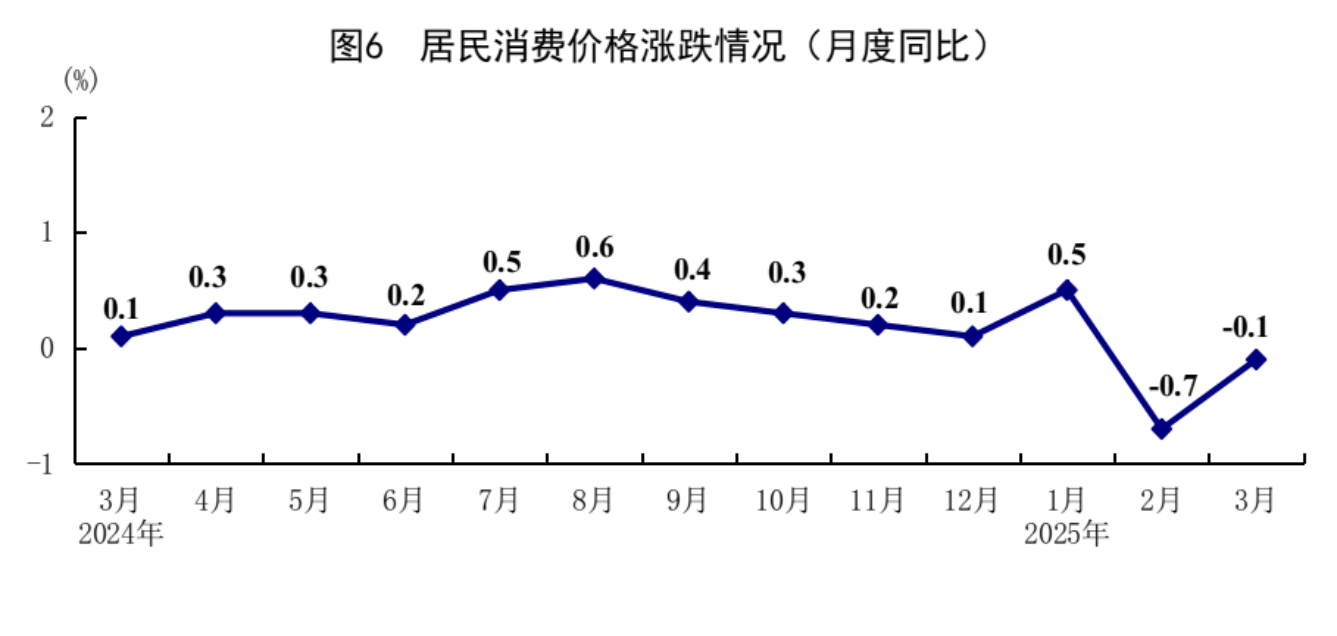 一季度,全国居民消费价格(CPI)同比下降0.1%。分类别看,食品烟酒价格下降0.7%,衣着价格上涨1.2%,居住价格上涨0.1%,生活用品及服务价格下降0.4%,交通通信价格下降1.9%,教育文化娱乐价格上涨0.7%,医疗保健价格上涨0.3%,其他用品及服务价格上涨6.0%。在食品烟酒价格中,鲜菜价格下降5.9%,粮食价格下降1.4%,鲜果价格下降0.1%,猪肉价格上涨8.1%。扣除食品和能源价格后的核心CPI同比上涨0.3%。3月份,全国居民消费价格同比下降0.1%,降幅比上月收窄0.6个百分点;环比下降0.4%。