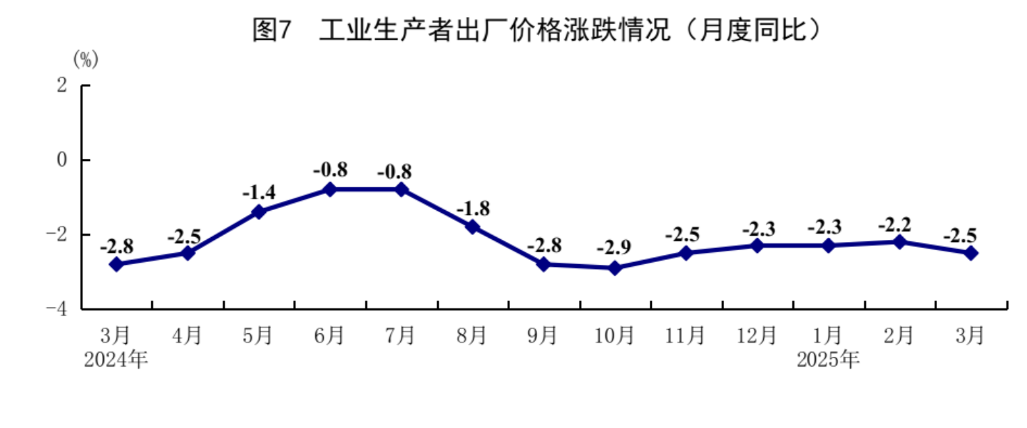 一季度,全国工业生产者出厂价格同比下降2.3%。其中,3月份同比下降2.5%,环比下降0.4%。一季度,工业生产者购进价格同比下降2.3%。其中,3月份同比下降2.4%,环比下降0.2%。
