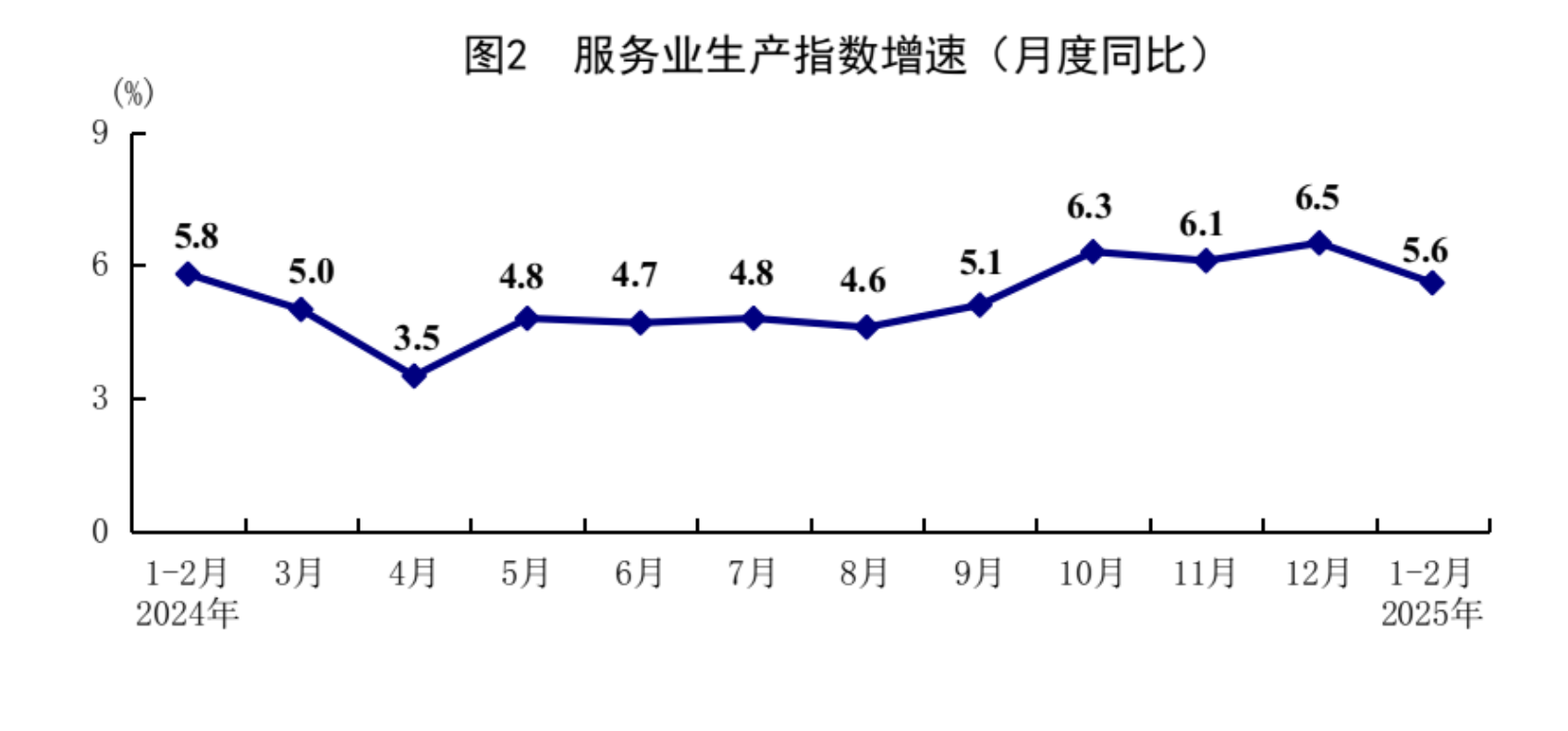 1-2月份,全国服务业生产指数同比增长5.6%,比上年全年加快0.4个百分点。分行业看,信息传输、软件和信息技术服务业,租赁和商务服务业,批发和零售业,金融业生产指数同比分别增长9.3%、8.8%、5.6%、5.5%。2月份,服务业商务活动指数为50.0%;服务业业务活动预期指数为56.9%。其中,航空运输、邮政、电信广播电视及卫星传输服务、货币金融服务、资本市场服务等行业商务活动指数均位于55.0%以上较高景气区间。