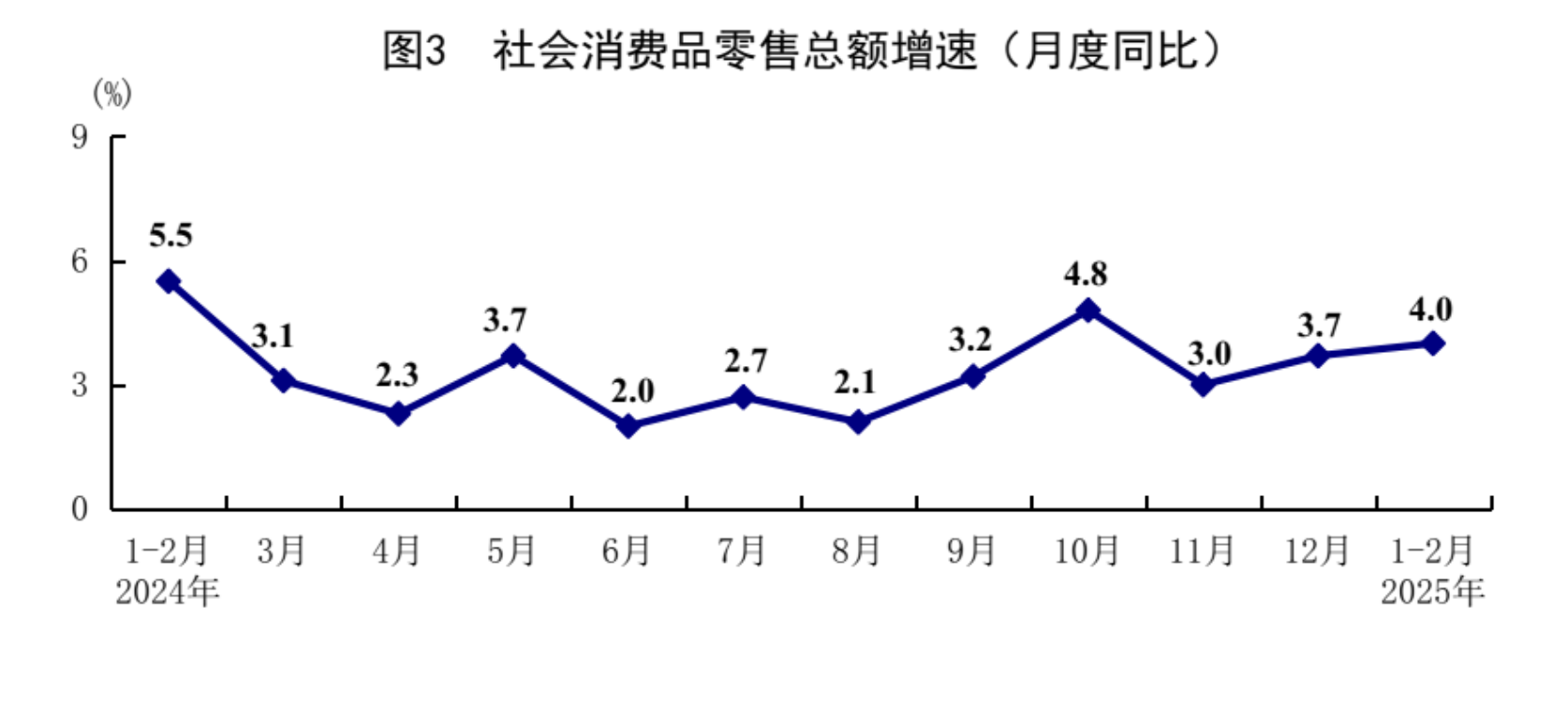 1-2月份,社会消费品零售总额83731亿元,同比增长4.0%,比上年全年加快0.5个百分点。按经营单位所在地分,城镇消费品零售额72462亿元,增长3.8%;乡村消费品零售额11269亿元,增长4.6%。按消费类型分,商品零售额73939亿元,增长3.9%;餐饮收入9792亿元,增长4.3%。基本生活类和部分升级类商品销售增势较好,限额以上单位粮油食品类、体育娱乐用品类商品零售额分别增长11.5%、25.0%。消费品以旧换新政策继续显效,限额以上单位通讯器材类、文化办公用品类、家具类、家用电器和音像器材类商品零售额分别增长26.2%、21.8%、11.7%、10.9%。全国网上零售额22763亿元,同比增长7.3%。其中,实物商品网上零售额18633亿元,增长5.0%,占社会消费品零售总额的比重为22.3%。从环比看,2月份社会消费品零售总额比上月增长0.35%。1-2月份,服务零售额同比增长4.9%。