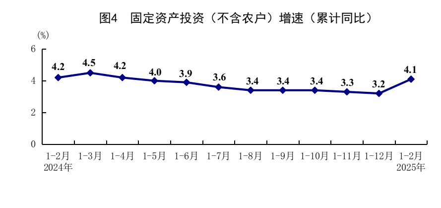 1-2月份,全国固定资产投资(不含农户)52619亿元,同比增长4.1%,比上年全年加快0.9个百分点;扣除房地产开发投资,全国固定资产投资增长8.4%。分领域看,基础设施投资同比增长5.6%,制造业投资增长9.0%,房地产开发投资下降9.8%。全国新建商品房销售面积10746万平方米,同比下降5.1%,降幅比上年全年收窄7.8个百分点;新建商品房销售额10259亿元,下降2.6%,降幅收窄14.5个百分点。分产业看,第一产业投资同比增长12.2%,第二产业投资增长11.4%,第三产业投资增长0.7%。民间投资同比持平;扣除房地产开发投资,民间投资增长6.0%。高技术产业投资同比增长9.7%,其中信息服务业、电子商务服务业、计算机及办公设备制造业、航空航天器及设备制造业投资分别增长66.4%、31.9%、31.6%、27.1%。从环比看,2月份固定资产投资(不含农户)比上月增长0.49%。
