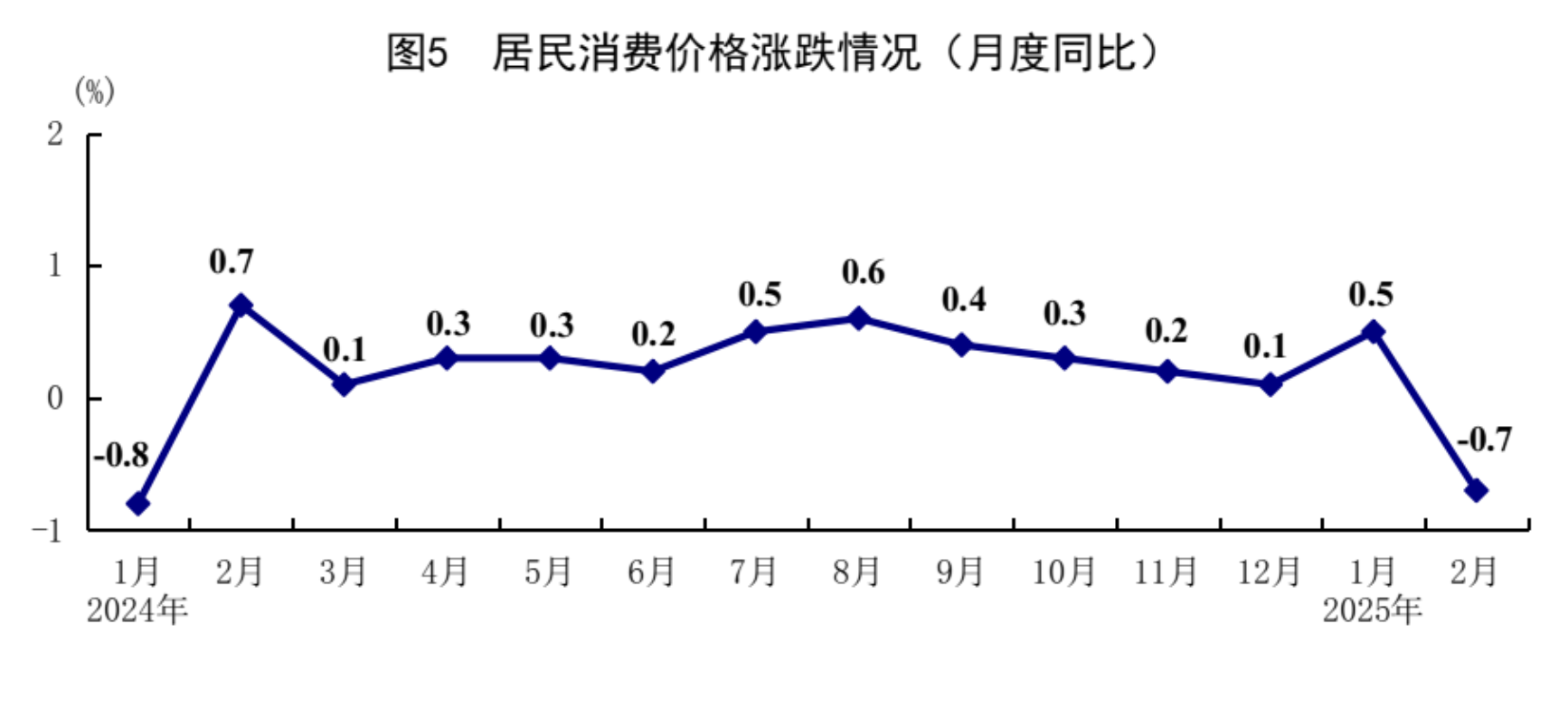 1-2月份,全国居民消费价格(CPI)同比下降0.1%,其中1月份上涨0.5%,2月份下降0.7%。分类别看,1-2月份,食品烟酒价格同比下降0.7%,衣着价格上涨1.1%,居住价格上涨0.1%,生活用品及服务价格下降0.9%,交通通信价格下降1.6%,教育文化娱乐价格上涨0.6%,医疗保健价格上涨0.4%,其他用品及服务价格上涨5.9%。在食品烟酒价格中,鲜菜价格下降5.5%,粮食价格下降1.4%,鲜果价格下降0.6%,猪肉价格上涨8.8%。扣除食品和能源价格后的核心CPI同比上涨0.3%。从环比看,1月份,全国居民消费价格上涨0.7%,2月份下降0.2%。