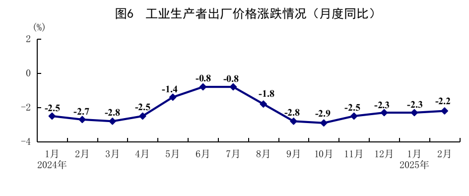 1-2月份,全国工业生产者出厂价格同比下降2.2%。分月看,1月份同比下降2.3%,环比下降0.2%;2月份同比下降2.2%,降幅比上月收窄0.1个百分点,环比下降0.1%。1-2月份,全国工业生产者购进价格同比下降2.3%。