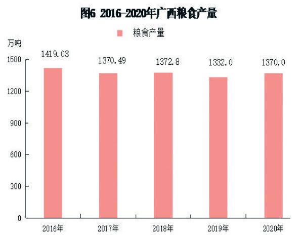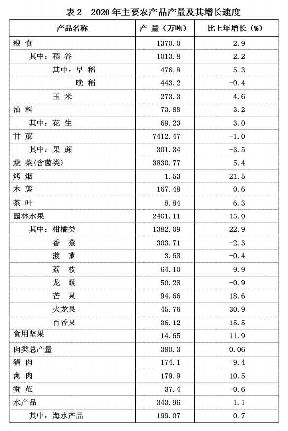 全年全区粮食总产量1370万吨,比上年增加38万吨,增长2.9%。其中,春收粮食产量26.0万吨,增长30.0%;早稻产量476.8万吨,增长5.3%;秋粮产量867.3万吨,增长0.9%。全年谷物产量1290.9万吨,增长2.5%。其中,稻谷产量1013.8万吨,增长2.2%;玉米产量273.3万吨,增长4.6%。