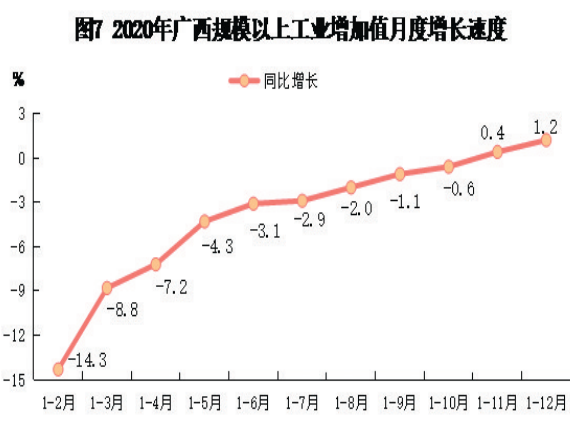 全年全区规模以上工业中,农副食品加工业增加值比上年下降7.8%,木材加工和木竹藤棕草制品业增长5.4%,石油煤炭及其他燃料加工业下降30.6%,非金属矿物制品业增长10.6%,黑色金属冶炼及压延加工业增长34.8%,有色金属冶炼及压延加工业增长21.9%,专用设备制造业下降5.7%,汽车制造业下降13.5%,电气机械及器材制造业增长7.7%,计算机、通信和其他电子设备制造业下降10.7%,电力、热力生产和供应业增长5.6%。
