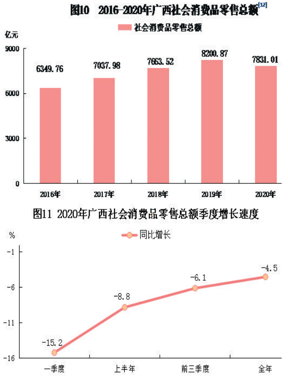 全年全区社会消费品零售总额7831.01亿元,比上年下降4.5%。按经营地统计,城镇消费品零售额6786.70亿元,下降4.6%;乡村消费品零售额1044.31亿元,下降3.8%。按消费类型统计,商品零售额6718.33亿元,下降4.2%;餐饮收入额1112.68亿元,下降6.4%。