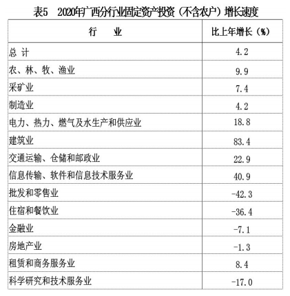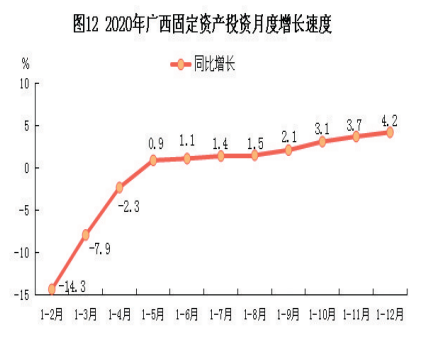 全年全区固定资产投资(不含农户)比上年增长4.2%,其中,第一产业投资增长9.9%;第二产业投资增长9.4%,其中工业投资增长7.7%;第三产业投资增长2.6%。基础设施投资增长12.9%。民间固定资产投资下降6.1%。