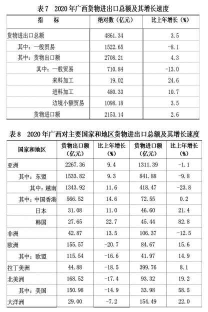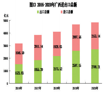 全年全区货物进出口总额4861.34亿元,比上年增长3.5%。其中,出口2708.21亿元,增长4.3%;进口2153.14亿元,增长2.6%。进出口顺差(进口小于出口)555.07亿元,比上年增长11.2%。对东盟国家进出口总额2375.70亿元,比上年增长1.7%。其中,出口1533.82亿元,增长9.3%;进口841.88亿元,下降9.8%。