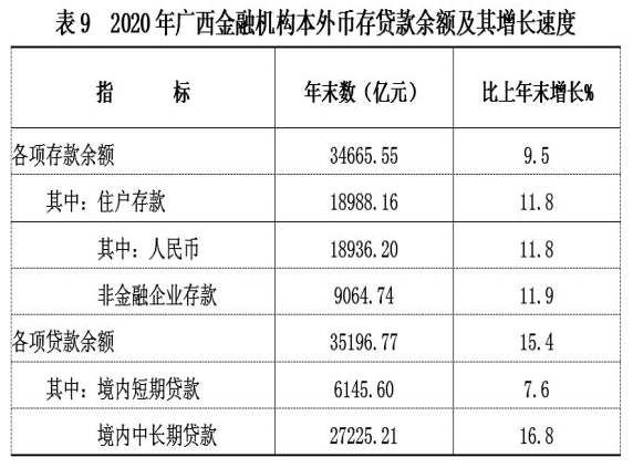 年末全区金融机构本外币各项存款余额34665.55亿元,比年初增加3019.55亿元,其中人民币各项存款余额34515.57亿元,增加3010.59亿元。年末金融机构本外币各项贷款余额35196.77亿元,比年初增加4699.38亿元,其中人民币各项贷款余额34738.99亿元,增加4750.47亿元。