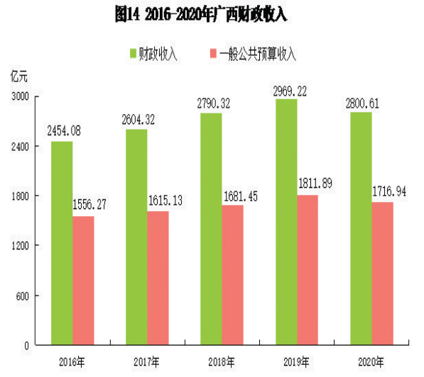 全年全区财政收入2800.61亿元,比上年下降5.7%;一般公共预算收入1716.94亿元,下降5.2%,其中税收收入1113.22亿元,下降2.9%,占一般公共预算收入的比重为64.8%。全区一般公共预算支出6155.42 亿元,比上年增长5.2%,其中,民生重点领域支出4943.95亿元,增长5.4%,占一般公共预算支出的比重为80.3%。