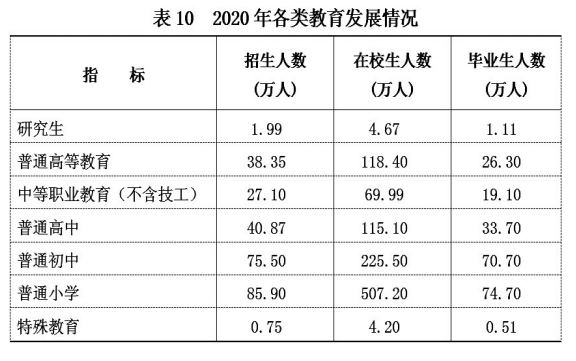 全年全区研究生教育招生1.99万人,在校研究生4.67万人,毕业生1.11万人。普通高等教育招生38.35万人,在校生118.4万人,毕业生26.30万人。各类中等职业教育(不含技工)招生27.10万人,在校生69.99万人,毕业生19.10万人。普通高中招生40.87万人,在校生115.10万人,毕业生33.70万人。普通初中招生75.50万人,在校生225.50万人,毕业生70.70万人。普通小学招生85.90万人,在校生507.20万人,毕业生74.70万人。特殊教育招生0.75万人,在校生4.20万人,毕业生0.51万人。学前教育在园幼儿226.60万人。九年义务教育巩固率为96%,高中阶段毛入学率为91%。