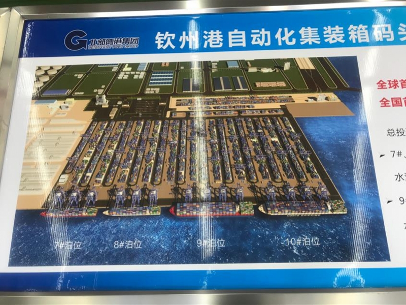 在钦州港的7、8号泊位,记者见到了铺进码头的火车铁轨示意图,铁轨一旁便是集装箱堆场和岸桥。