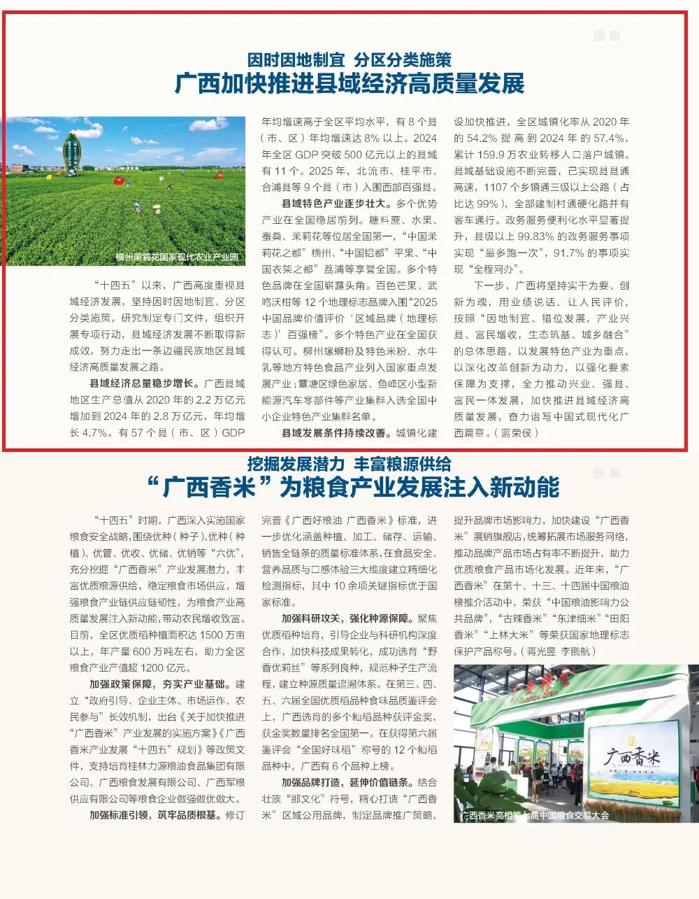 “十四五”以来,广西高度重视县域经济发展,坚持因时因地制宜、分区分类施策,研究制定专门文件,组织开展专项行动,县域经济发展不断取得新成效,努力走出一条边疆民族地区县域经济高质量发展之路。
