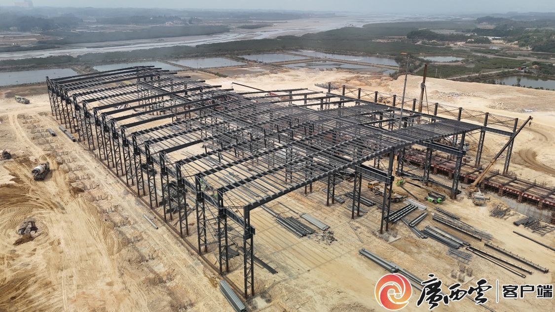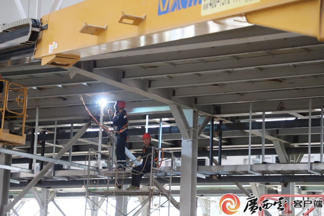 在广西宏旺新材料科技有限公司高性能硅钢项目建设现场,工人们正在紧张有序地进行厂房基础设施安装。