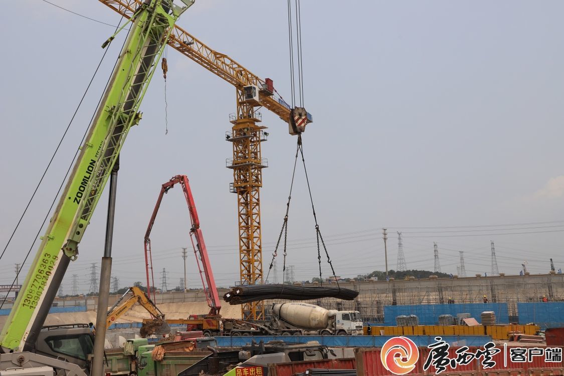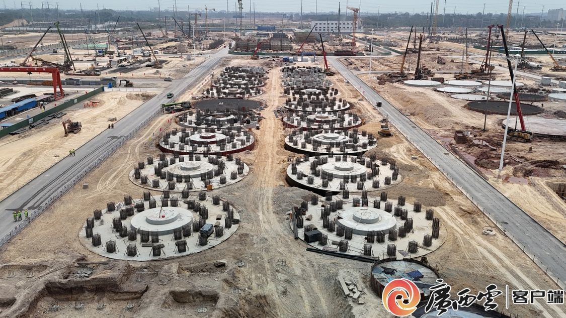 在广西防城港港口生态铝产业链项目现场,吊机舒展钢铁臂膀,将成捆钢筋精准吊运至作业面。工人们在地面默契配合,指挥声、机械轰鸣声交织。重型卡车不时轰鸣驶过,满载建材的车厢随颠簸微微震颤,在施工通道扬起阵阵尘土。
