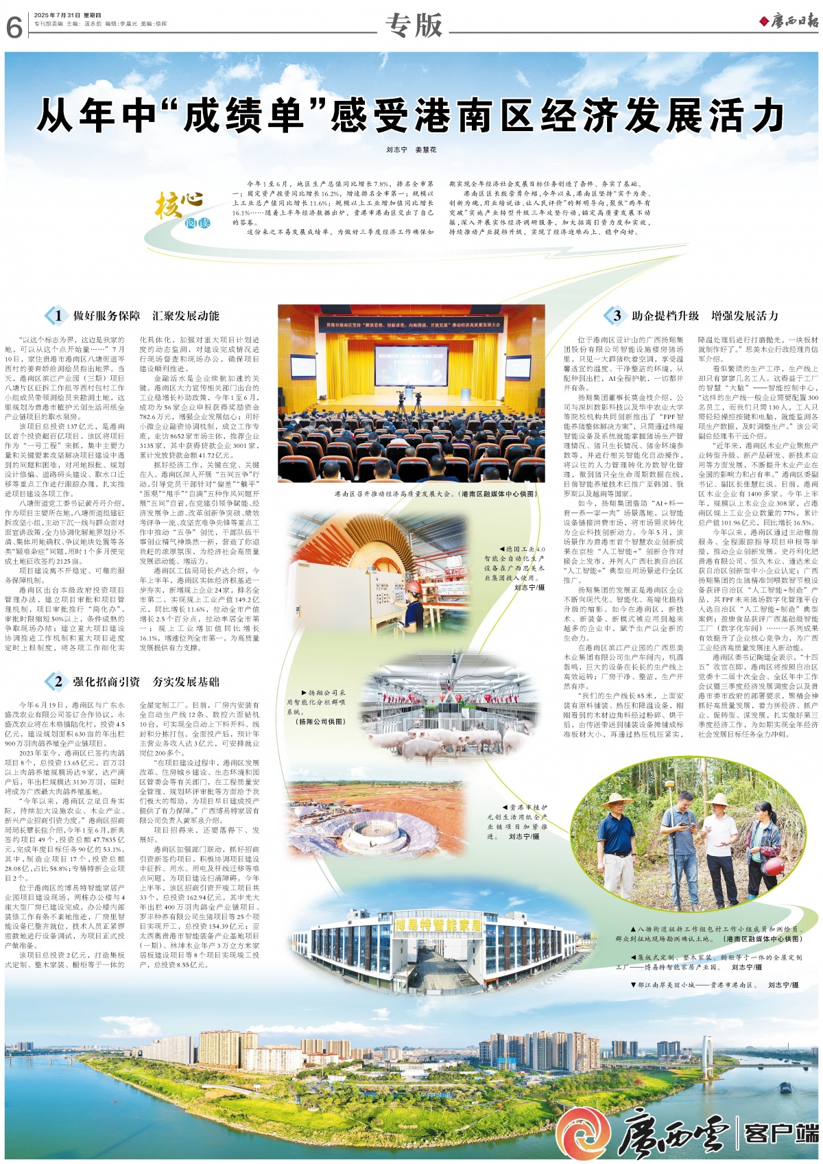 港南区区长殷崇勇介绍,今年以来,港南区坚持“实干为要、创新为魂,用业绩说话、让人民评价”的鲜明导向,聚焦“两年有突破”实施产业转型升级三年攻坚行动,锚定高质量发展不动摇,深入开展实体经济调研服务,加大招商引资力度和实效,持续推动产业提档升级,实现了经济迎难而上、稳中向好。