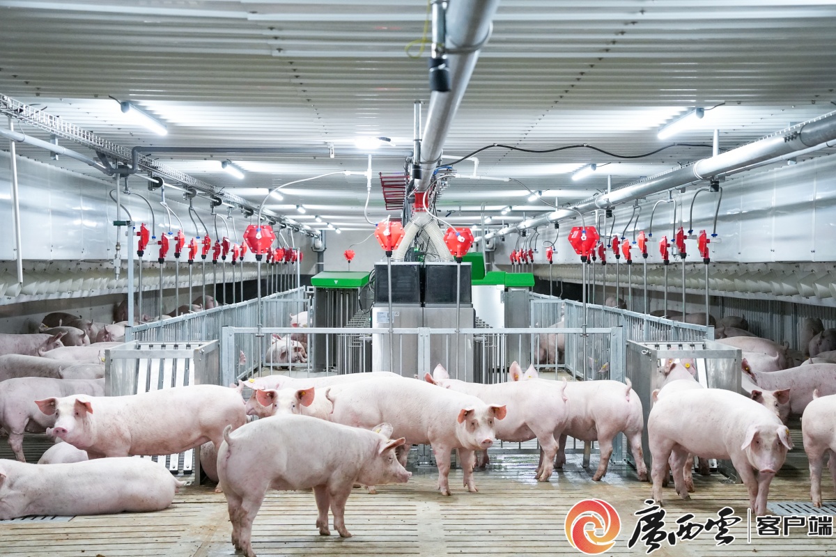 位于港南区亚计山的广西扬翔集团股份有限公司智能设施楼房猪场里,只见一大群猪吹着空调,享受适宜的温度、干净整洁的环境,从配种到出栏,AI全程护航,一切都井井有条。