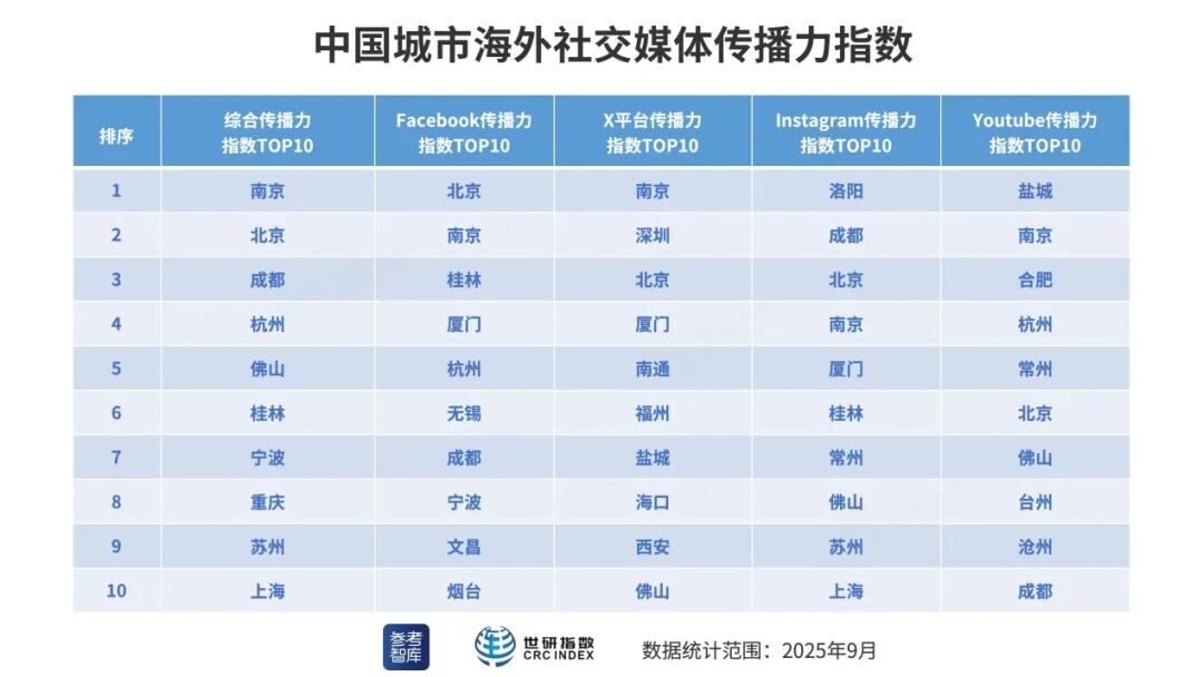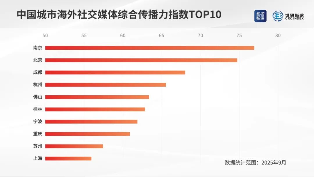 2025年9月,在综合传播力方面,排序相对靠前的中国城市为:南京、北京、成都、杭州、佛山、桂林、宁波、重庆、苏州、上海。