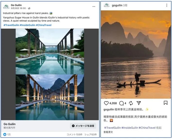 独特的喀斯特地貌是桂林在国际传播中的重要视觉要素。9月26日,桂林脸书账号发布一组阳朔糖舍照片。在喀斯特地貌的映衬下,昔日的老糖厂展现出优雅、尊贵之感。截至统计日,该网帖获得至少1万次点赞。