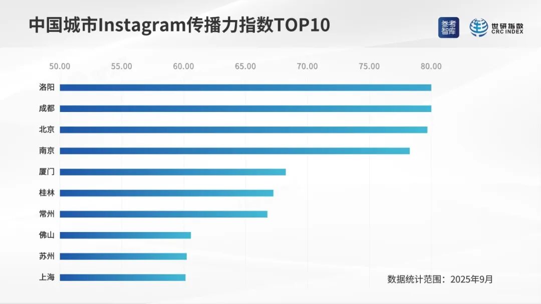 2025年9月,中国城市照片墙传播力指数排序相对靠前的城市是:洛阳、成都、北京、南京、厦门、桂林、常州、佛山、苏州、上海。