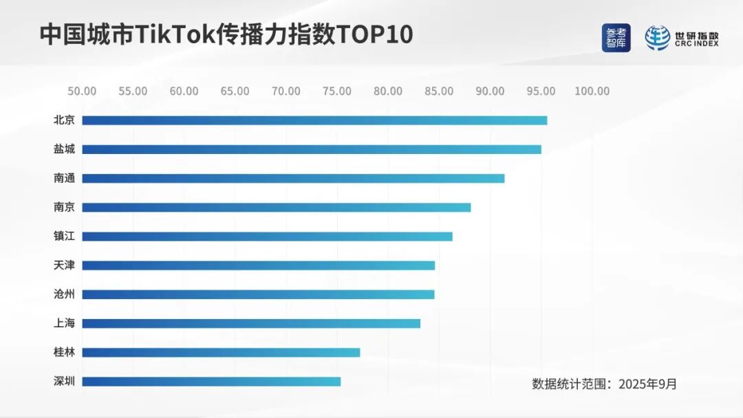 2025年9月,中国城市TikTok传播力指数排序相对靠前的是:北京、盐城、南通、南京、镇江、天津、沧州、上海、桂林、深圳。