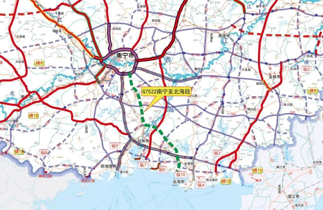 G7522贵阳至北海公路(南宁至北海段)项目主线全长152.92公里,新建段138.67公里,设计时速120公里/小时,采用双向四/六车道高速公路标准建设。路线起于南宁市邕宁区,止于北海市合浦县,项目建成后将显著提升北部湾城市群融合水平,强化南宁对周边区域的辐射带动作用。