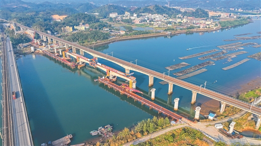 重点建设项目南防铁路钦州至防城港段增建二线工程茅岭江特大桥连续梁主跨顺利合龙,为后续施工奠定坚实基础。封荣权/摄