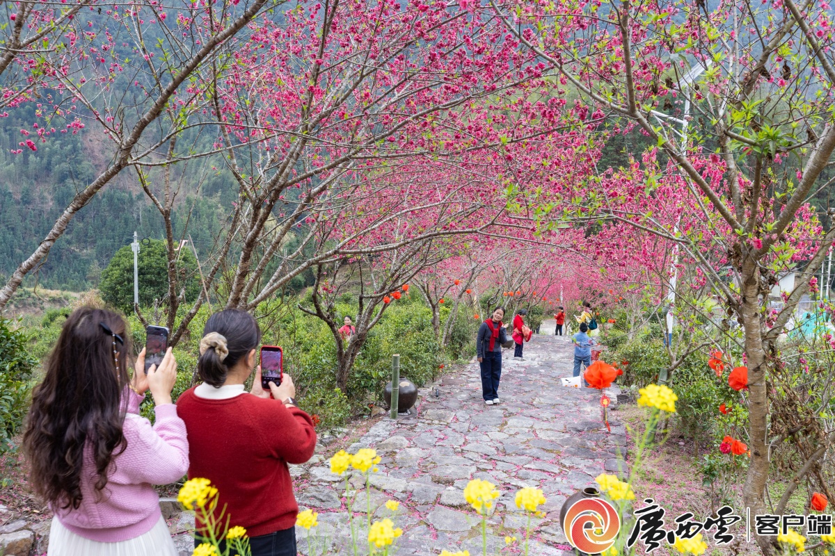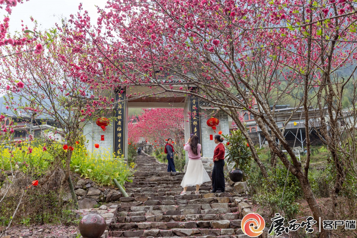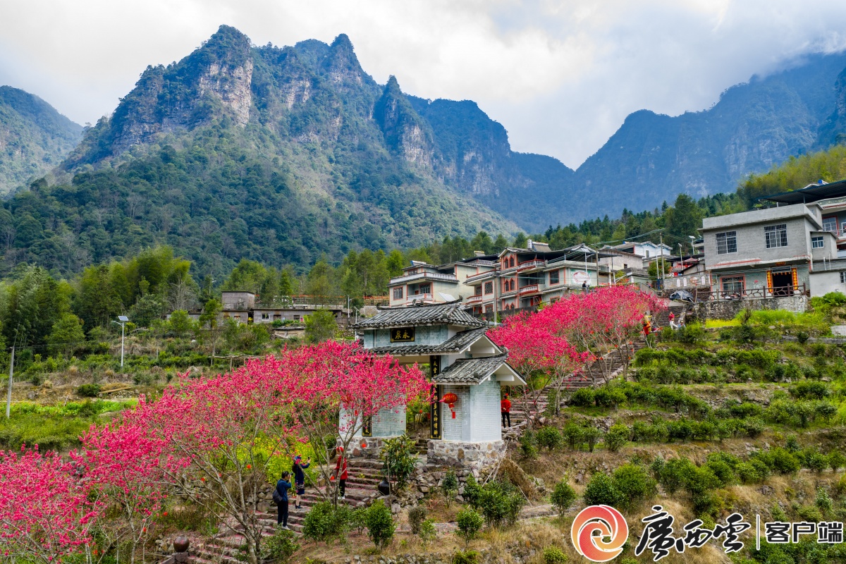 2月23日,来宾市金秀瑶族自治县忠良乡永和村永泉屯乡村旅游区,盛开的桃花与山村、喀斯特地貌相映成景,游客在桃花树下赏花、拍照,一幅初春画卷展现眼前。