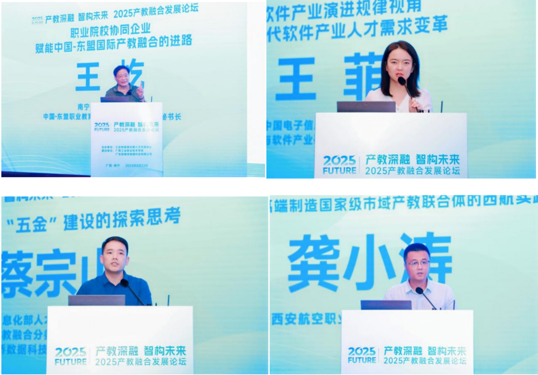 南宁师范大学二级教授、中国—东盟职业教育研究中心常务副主任兼秘书长王屹,中国电子信息产业发展研究院信息化与软件产业研究所产业研究室副主任王菲,广东职教桥数据科技有限公司董事副总经理蔡宗山,西安航空职业技术学院教务处处长龚小涛分别以“职业院校协同企业赋能中国——东盟国际产教融合的进路”“从软件产业演进规律视角看AI时代软件产业人才需求变革”“数智赋能“五金”建设的探索思考”“产教城一体 产学研融合 西安航空高端制造国家级市域产教联合体的西航实践”为主题进行了分享。