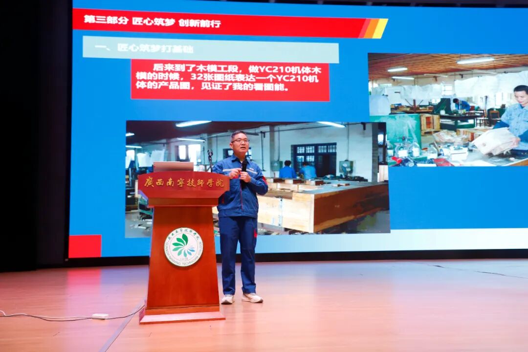 企业工匠大师主题报告环节,国务院政府特殊津贴专家,获评全国劳动模范、中华技能大奖、全国技术能手的广西玉柴机器股份有限公司先进成型技术与装备国家重点实验室副主任池昭就,以“高端制造的‘工匠密码’:专注、创新与技能报国实践”为题,分享了自己从一线工人成长为“大国工匠”的历程,并结合企业智能制造转型案例,强调“高技能人才是高端制造的核心竞争力”,鼓励师生以匠心铸匠魂,用技能赋能产业升级。